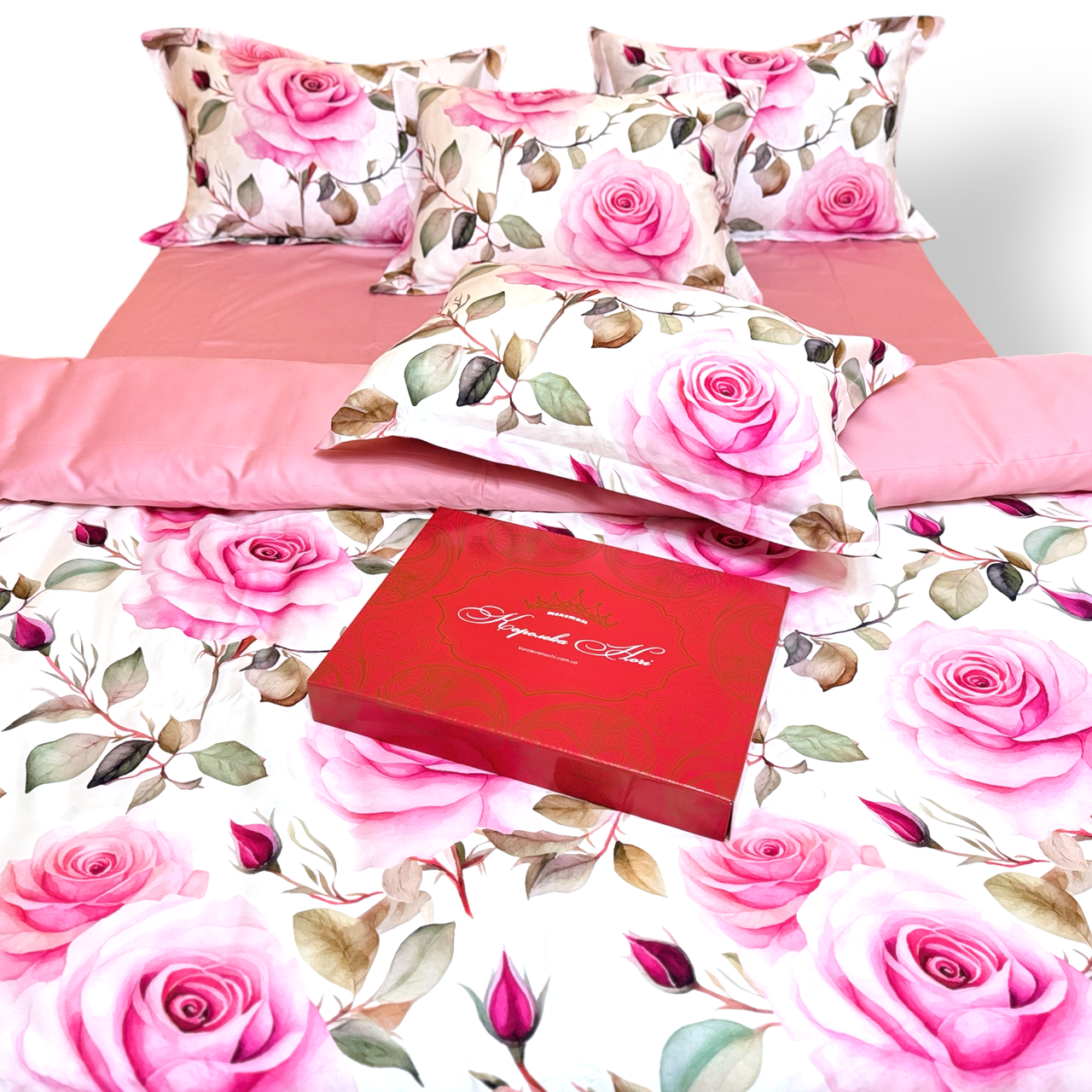 Постільна білизна Королева Ночі (Сатин Premium) | Полуторний комплект | 50х70 | Троянди на білому та рожевому
