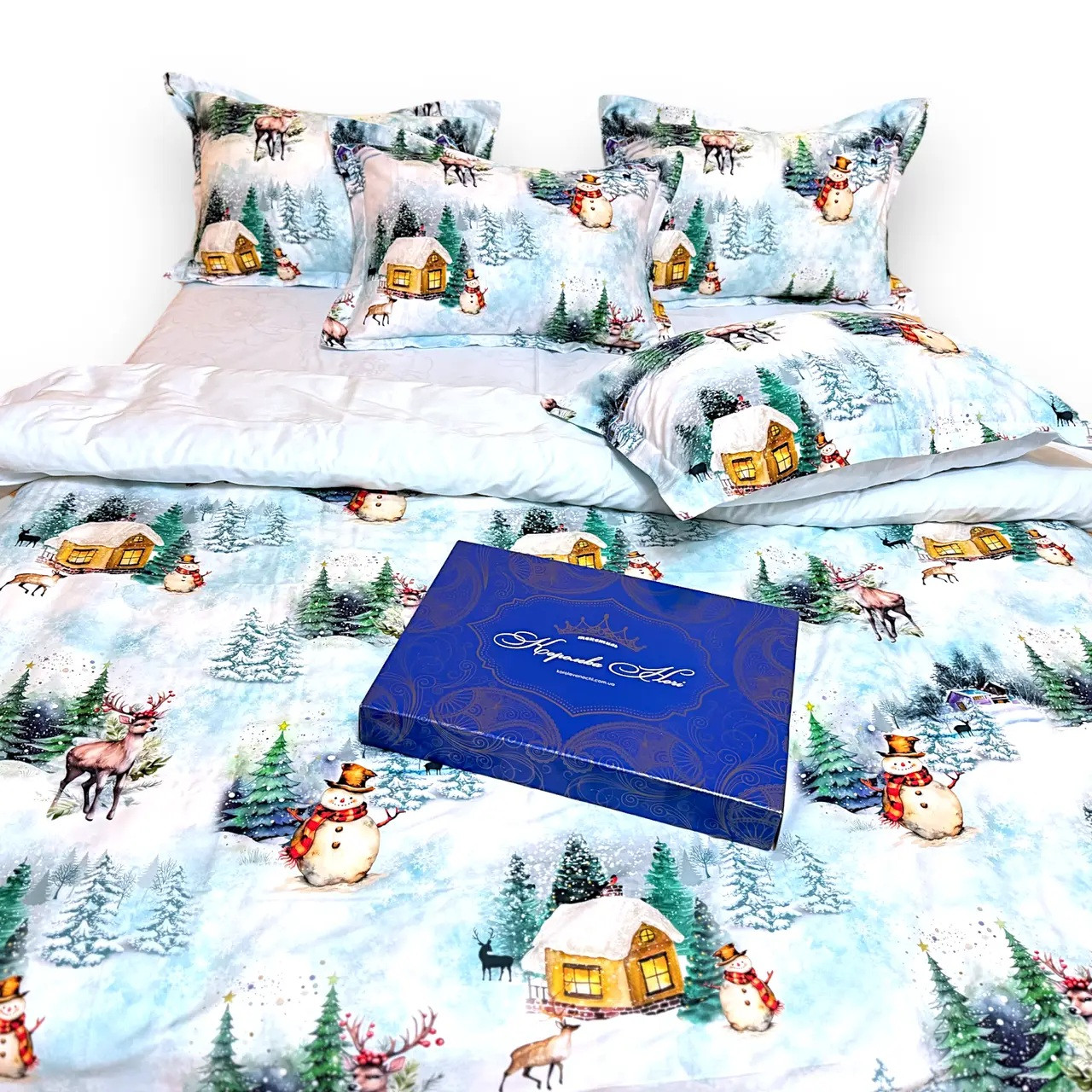 Підковдра на блискавці 145х215 Королева Ночі (Сатин Premium) | Полуторна | Сніговики, олені, ялинки на блакитному
